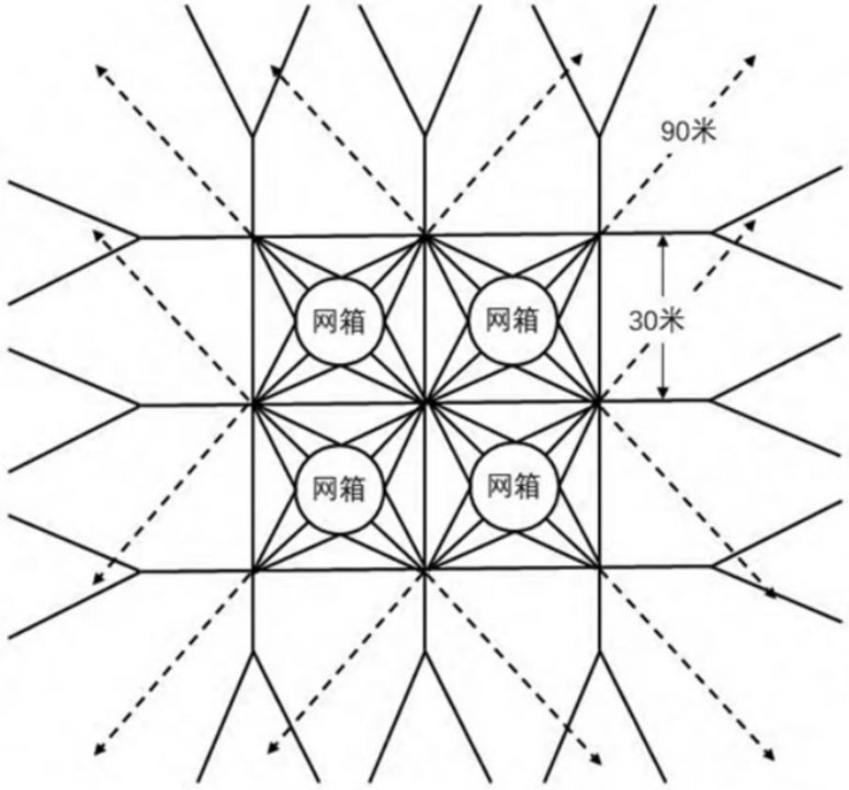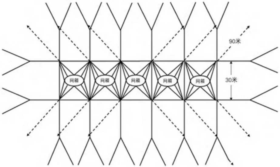 Hay dos métodos de anclaje más comúnmente utilizados para redes de aguas profundas, uno tiene forma de "一", cuatro o cinco jaulas en un grupo, y el otro tiene forma de "田", cuatro jaulas en un grupo.
